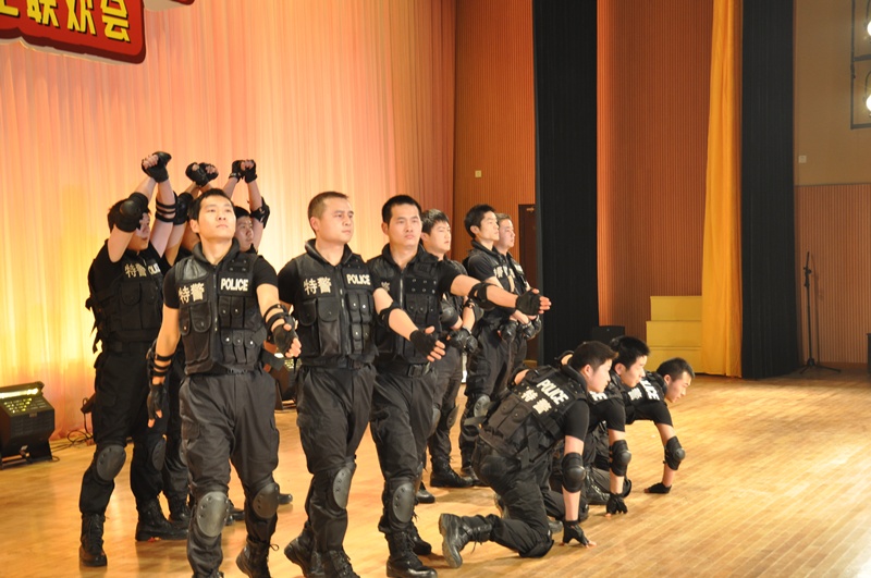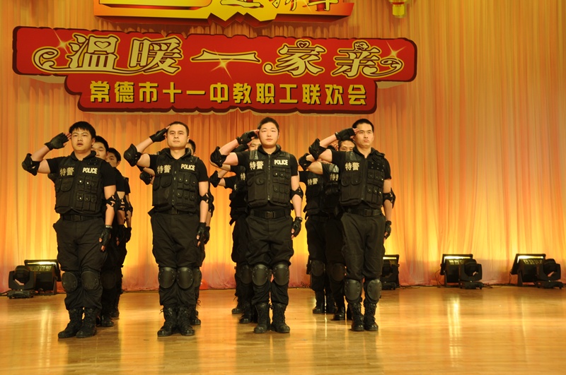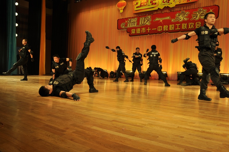 联谊会上,特警二大队12名特警队员表演了自创的警营舞蹈——《砺兵》。舞蹈的节奏铿锵有力,彰显了常德特警维护社会稳定的警界豪情;舞蹈的动作刚柔并济,展示了特警队员铁血柔情的别样风采。特警的精彩演出赢得了十一中全体师生的阵阵热烈掌声,并获得了二等奖。